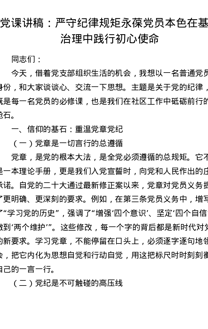 党课讲稿:严守纪律规矩 永葆党员本色 在基层治理中践行初心使命