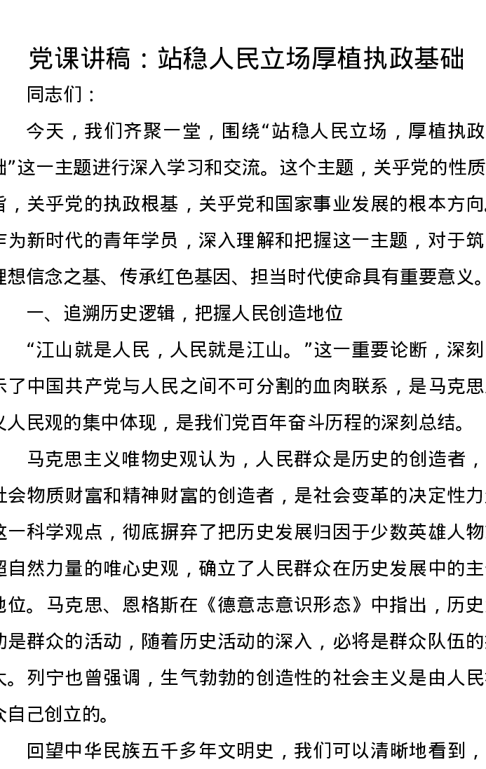党课讲稿:站稳人民立场 厚植执政基础