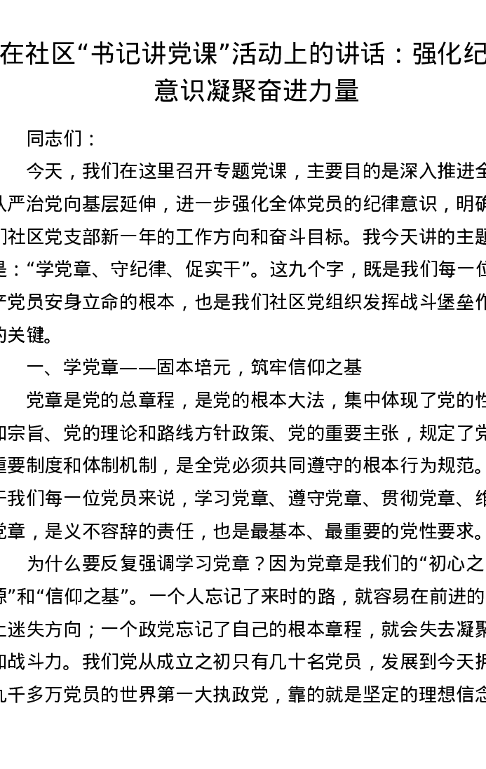 在社区 书记讲党课 活动上的讲话:强化纪律意识 凝聚奋进力量
