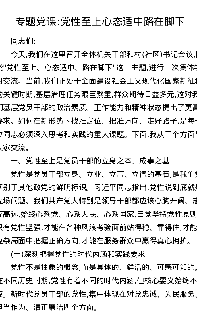 专题党课:党性至上心态适中路在脚下