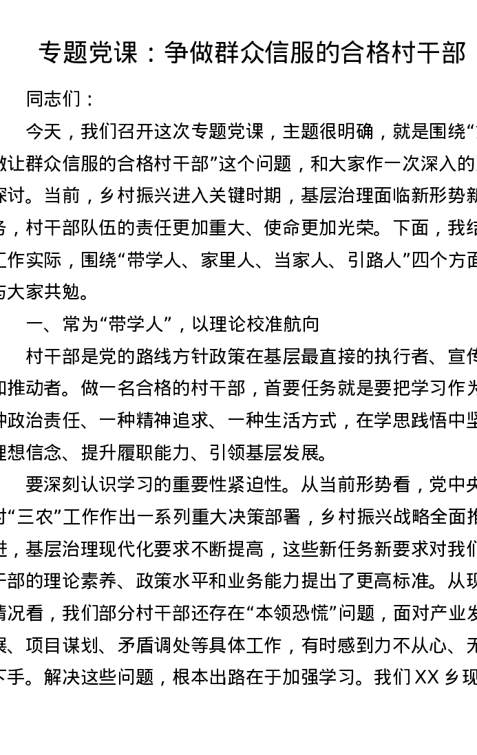 专题党课:争做群众信服的合格村干部