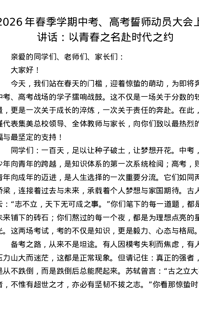 2026 年春季学期中考、高考誓师动员大会上的讲话:以青春之名赴时代之约