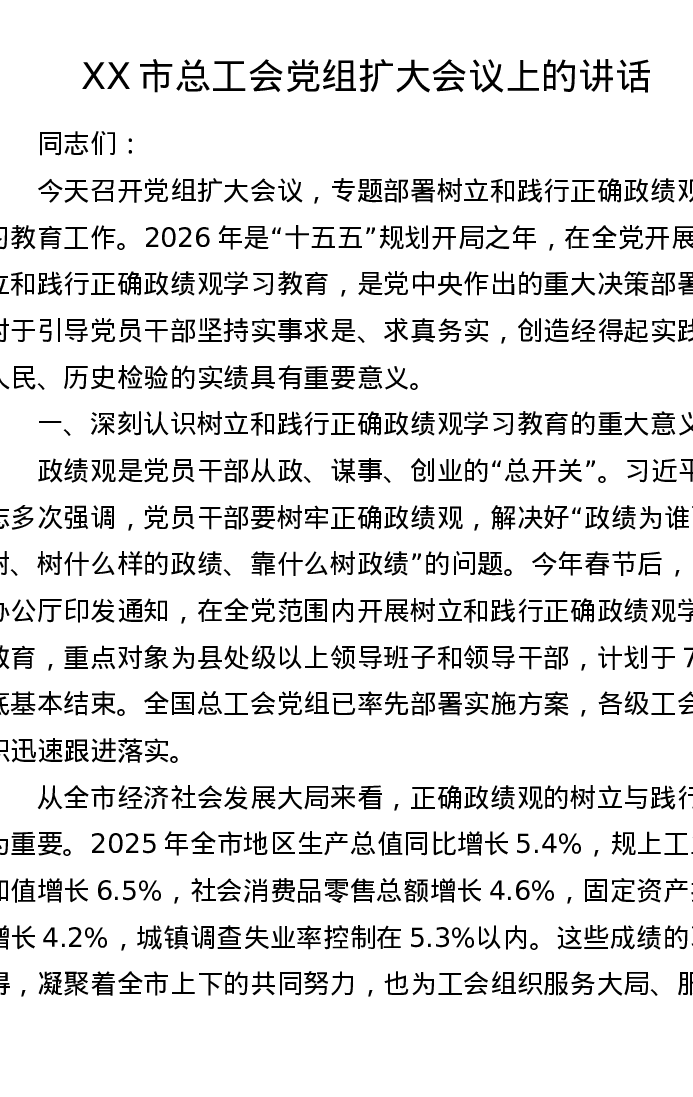 XX 市总工会党组扩大会议上的讲话