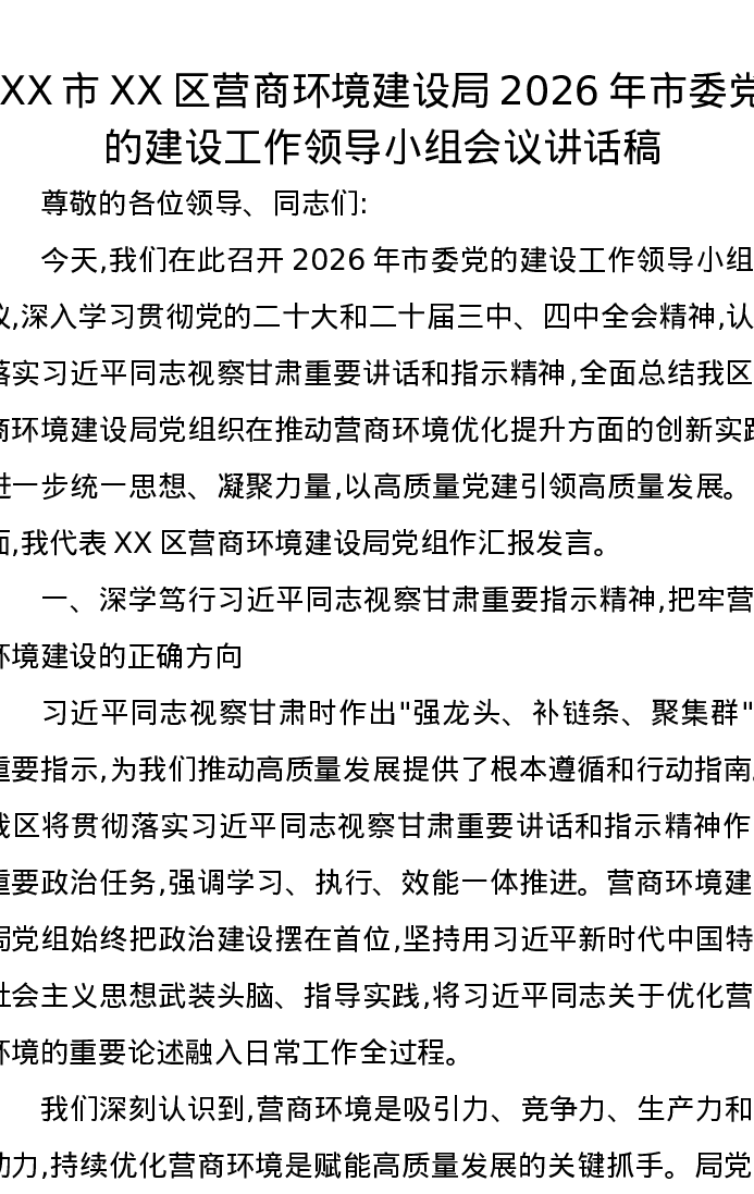 XX市XX区营商环境建设局2026年市委党的建设工作领导小组会议讲话稿
