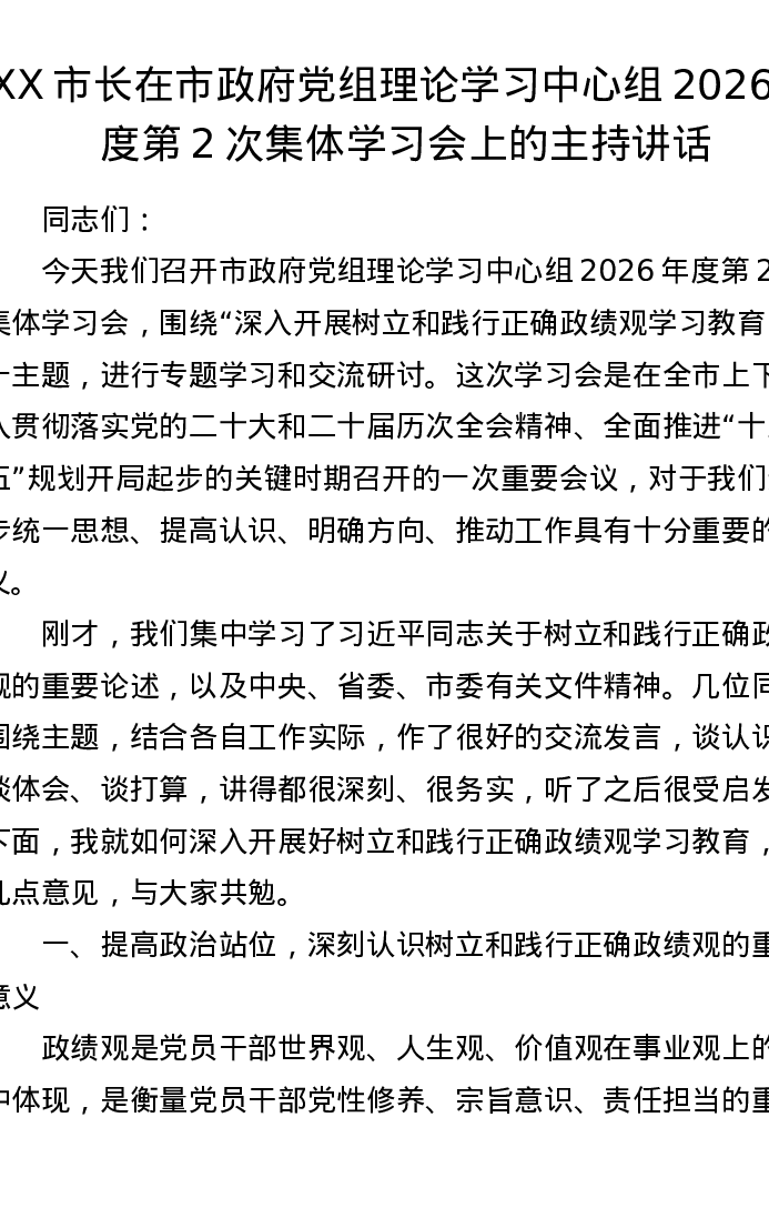 XX市长在市政府党组理论学习中心组2026年度第2次集体学习会上的主持讲话