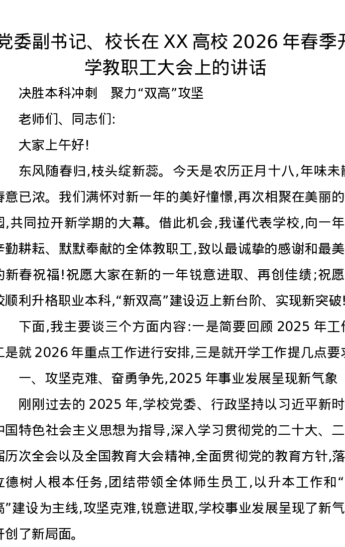 党委副书记、校长在XX高校2026年春季开学教职工大会上的讲话