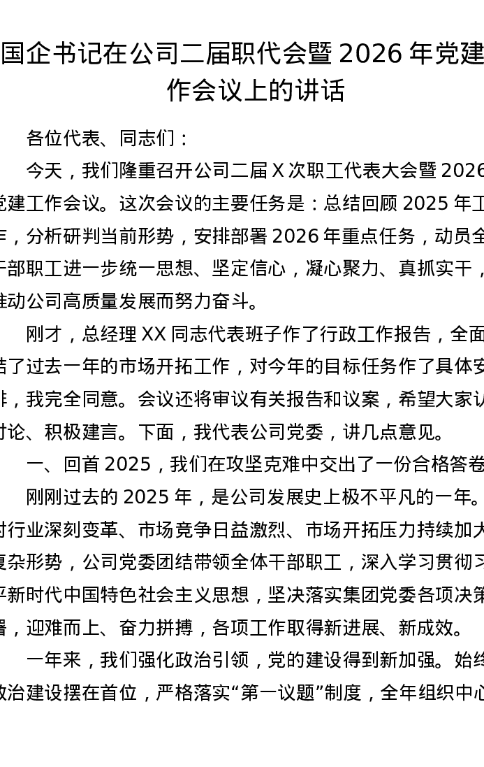 国企书记在公司二届职代会暨2026年党建工作会议上的讲话