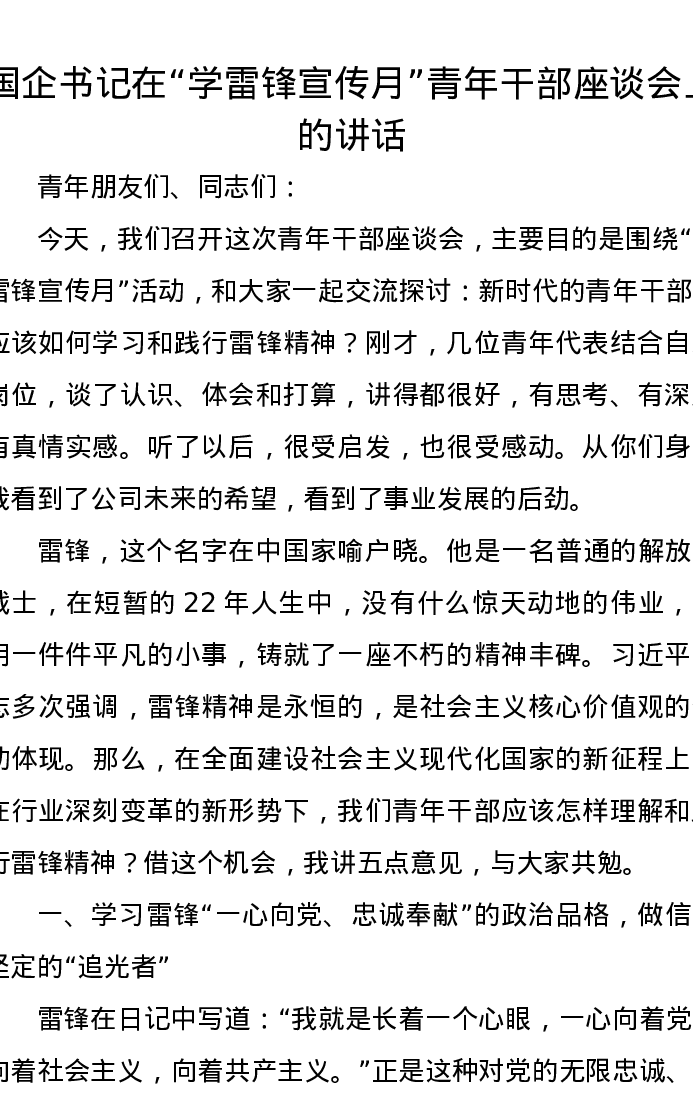 国企书记在学雷锋宣传月青年干部座谈会上的讲话