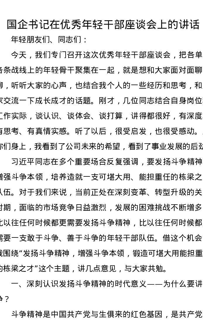 国企书记在优秀年轻干部座谈会上的讲话