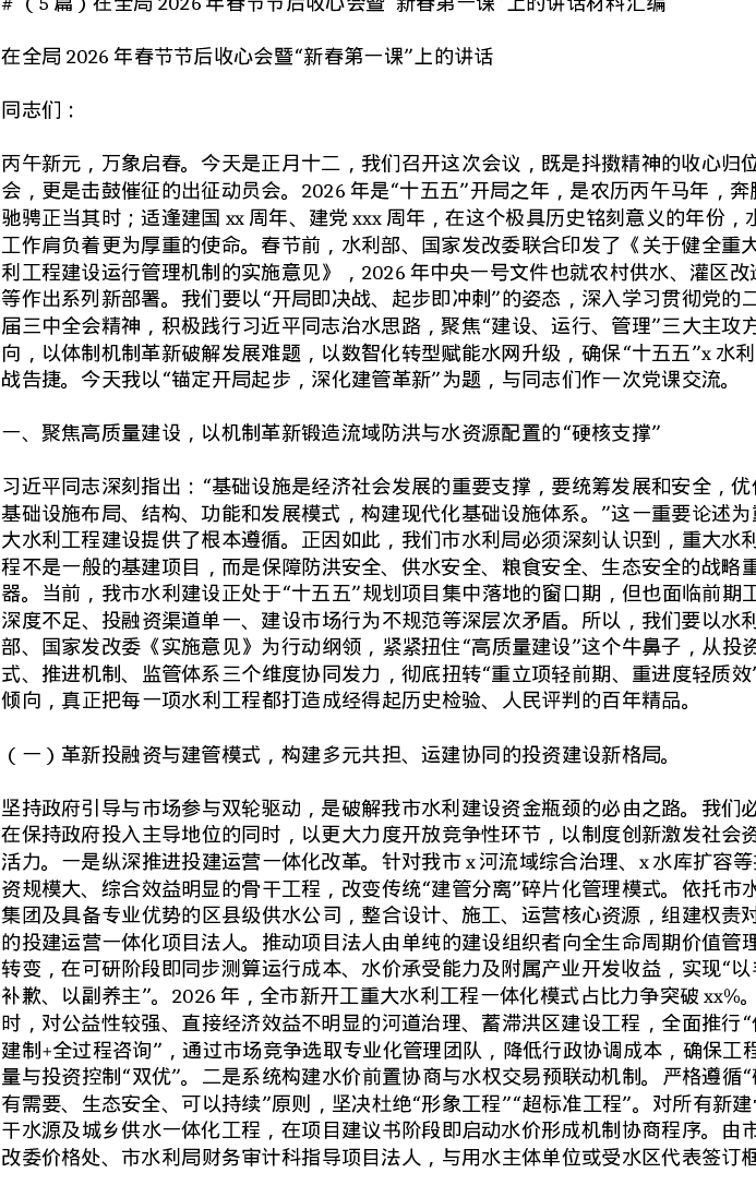 汇编:在全局2026年春节节后收心会暨新春第一课上的讲话5篇