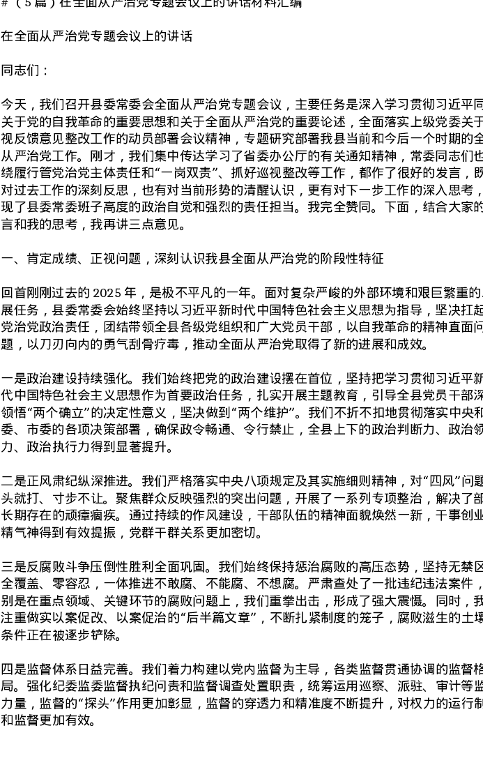 汇编:在全面从严治党专题会议上的讲话材料5篇