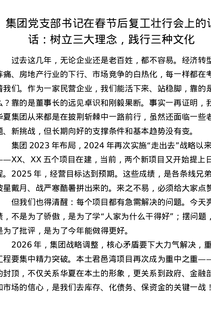 集团党支部书记在春节后复工壮行会上的讲话:树立三大理念,践行三种文化
