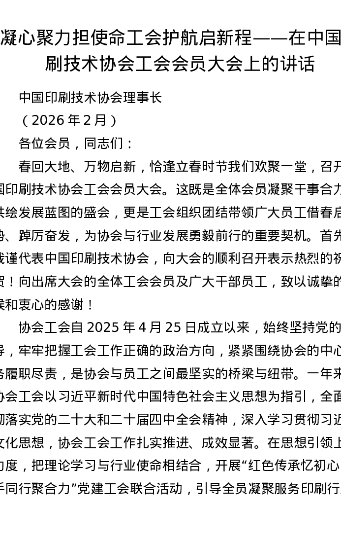 凝心聚力担使命 工会护航启新程——在中国印刷技术协会工会会员大会上的讲话