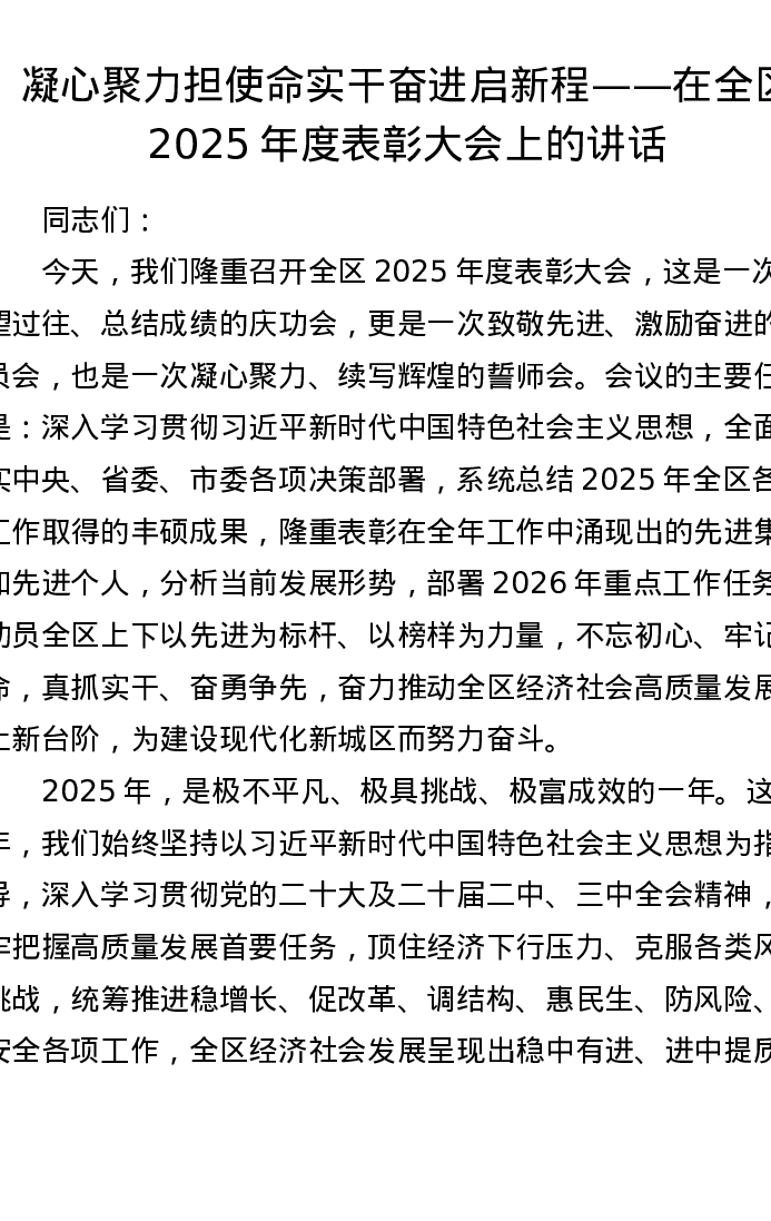 凝心聚力担使命 实干奋进启新程——在全区2025年度表彰大会上的讲话