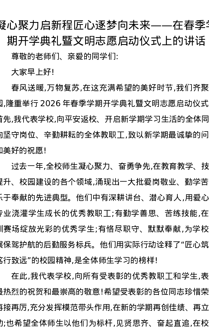 凝心聚力启新程匠心逐梦向未来——在春季学期开学典礼暨文明志愿启动仪式上的讲话