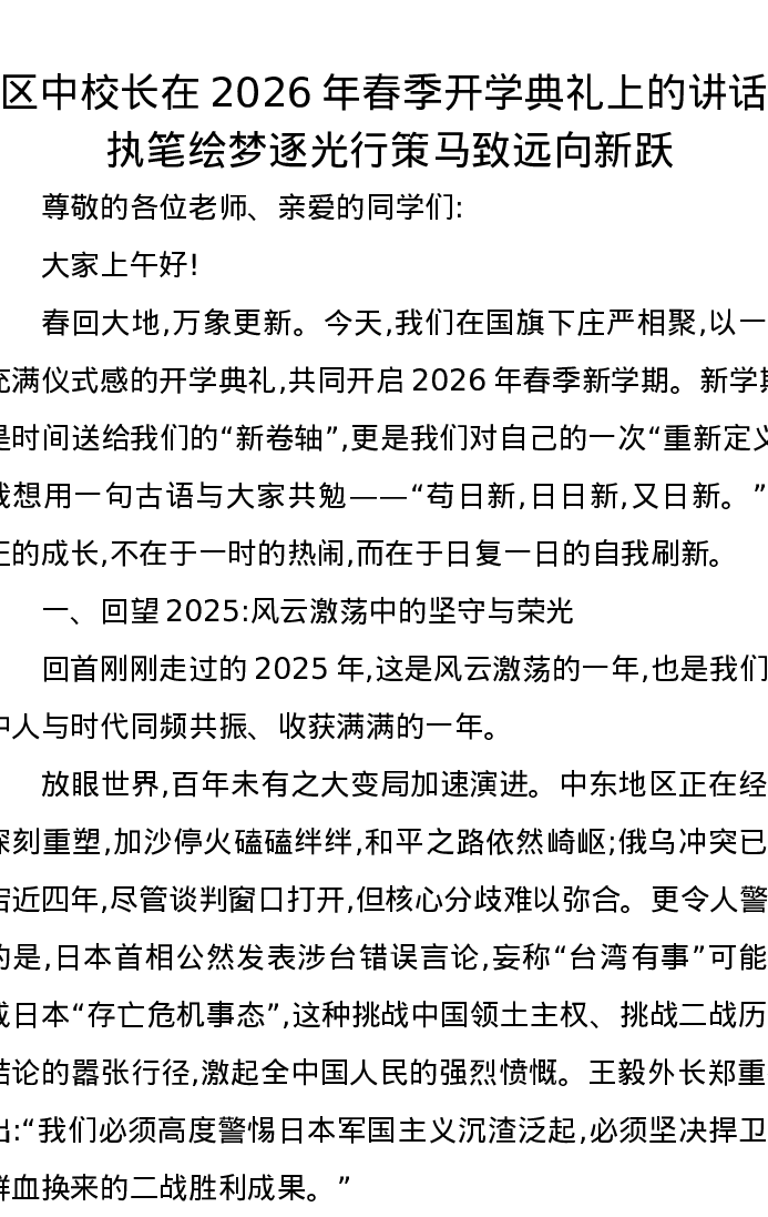 区中校长在2026年春季开学典礼上的讲话执笔绘梦逐光行策马致远向新跃