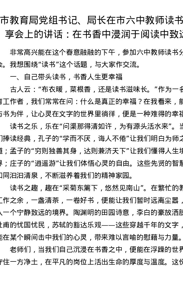 市教育局党组书记、局长在市六中教师读书分享会上的讲话:在书香中浸润于阅读中致远