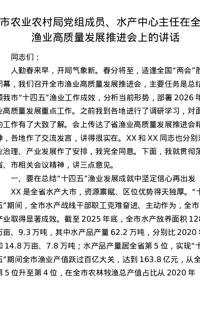 市农业农村局党组成员、水产中心主任在全市渔业高质量发展推进会上的讲话