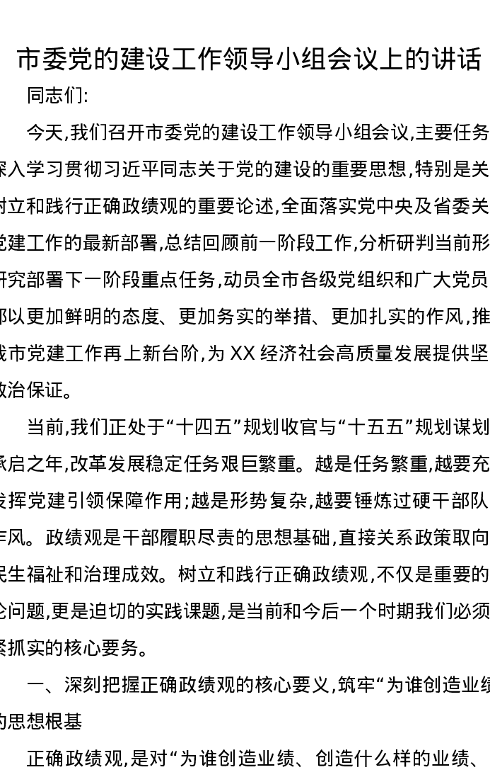 市委党的建设工作领导小组会议上的讲话