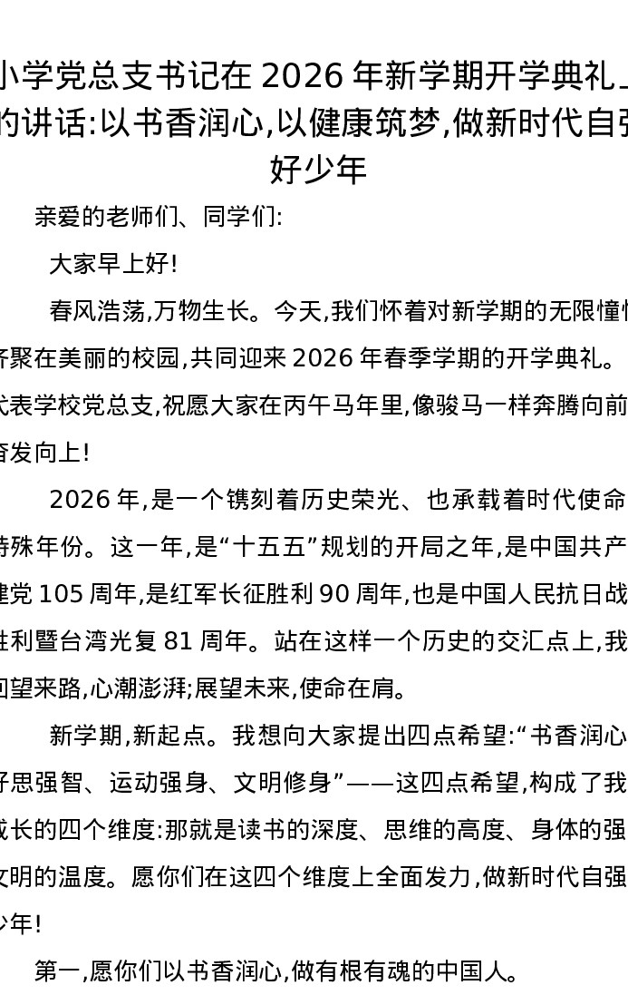 小学党总支书记在2026年新学期开学典礼上的讲话以书香润心,以健康筑梦,做新时代自强好少年