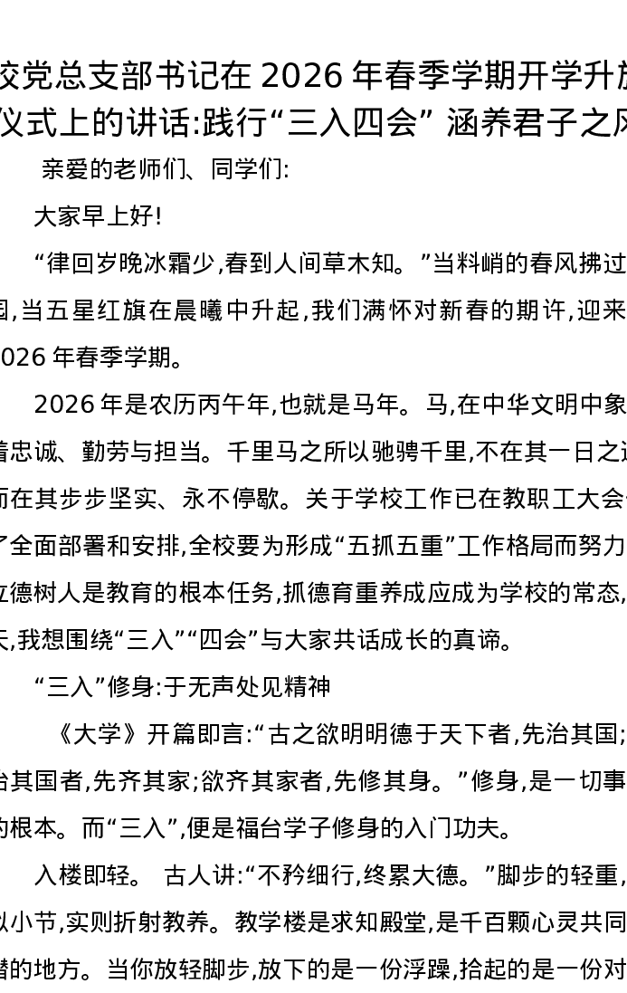 校党总支部书记在2026年春季学期开学升旗仪式上的讲话践行三入四会 涵养君子之风