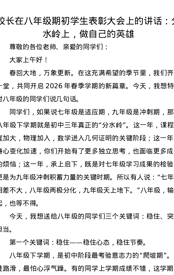 校长在八年级期初学生表彰大会上的讲话:分水岭上,做自己的英雄