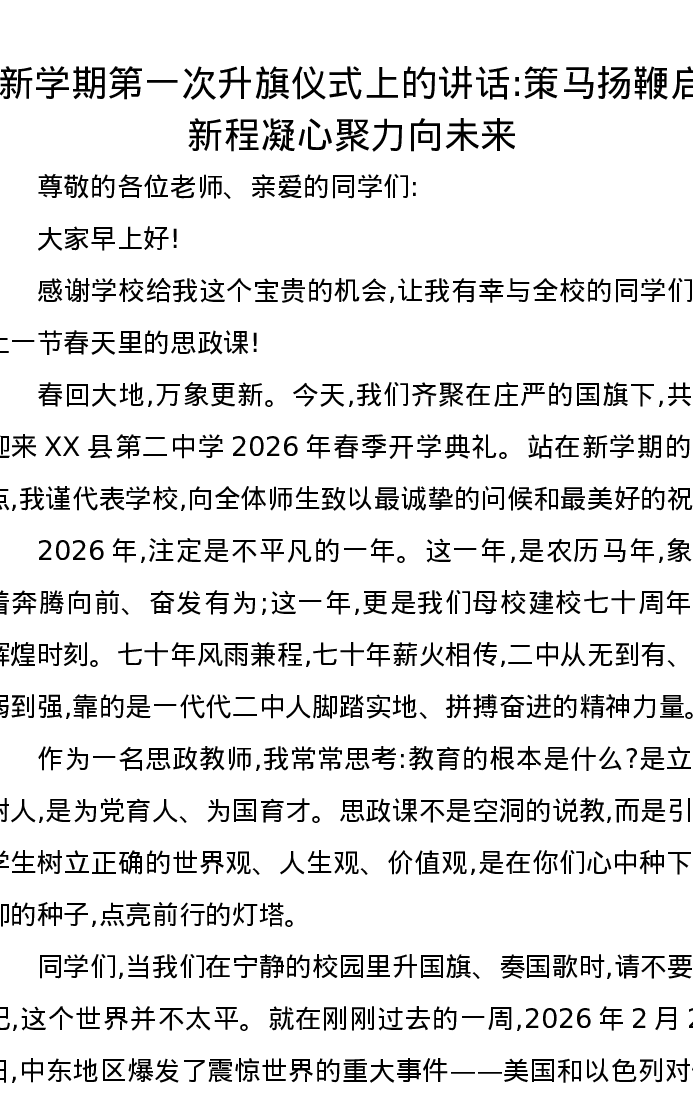 新学期第一次升旗仪式上的讲话:策马扬鞭启新程凝心聚力向未来