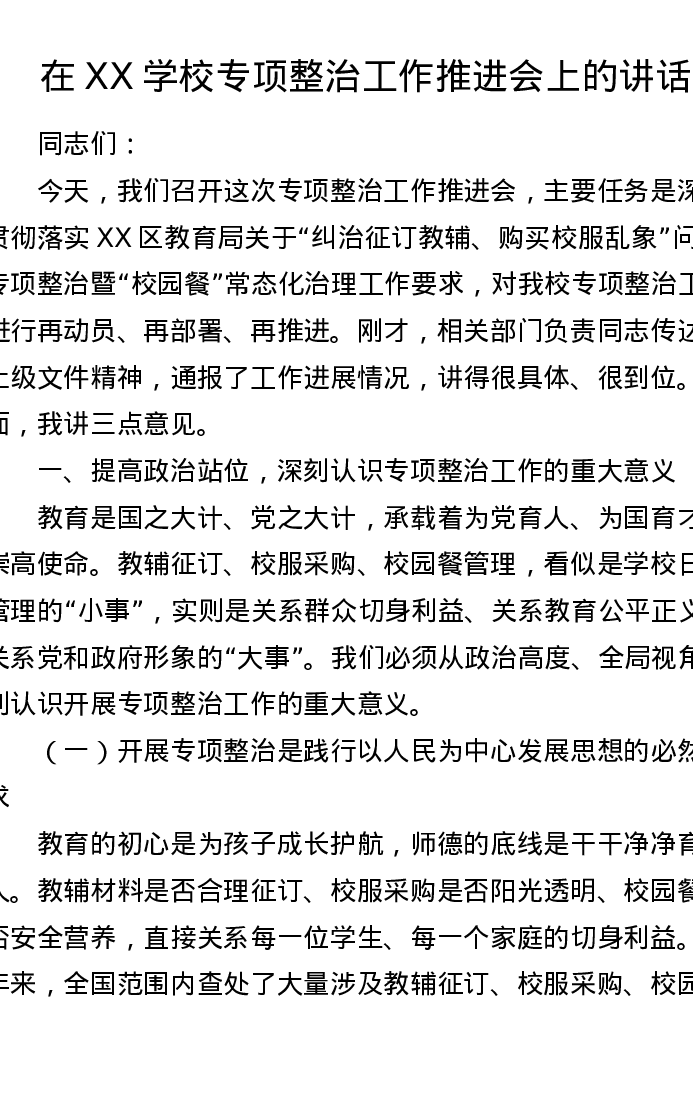 在 XX 学校专项整治工作推进会上的讲话