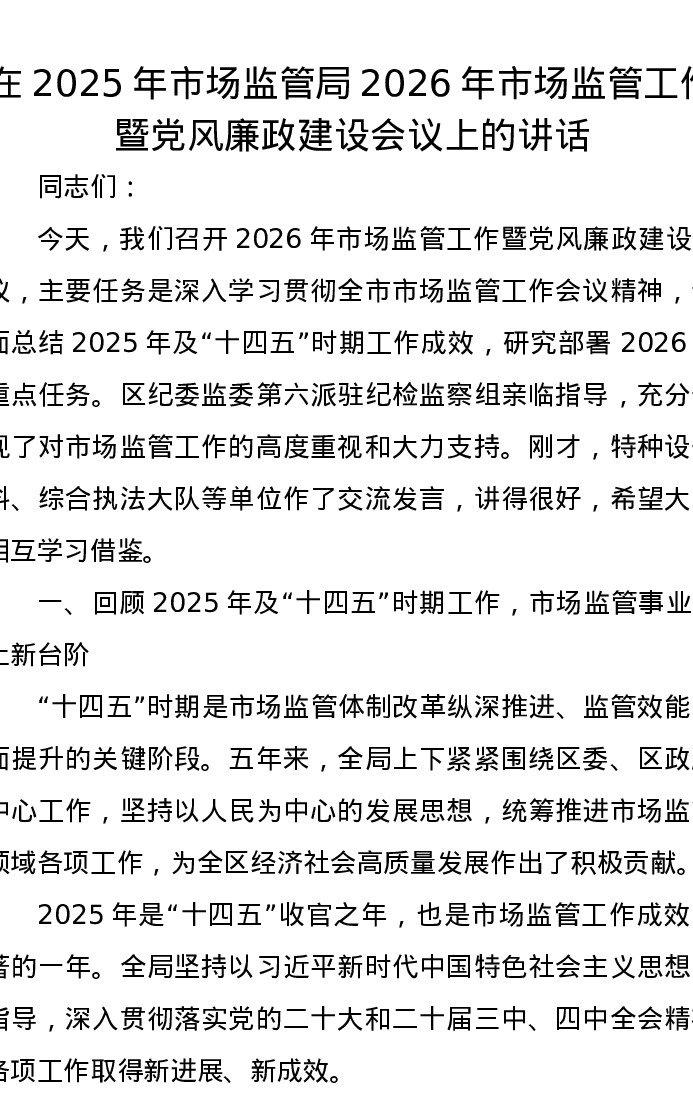 在2025年市场监管局2026年市场监管工作暨党风廉政建设会议上的讲话