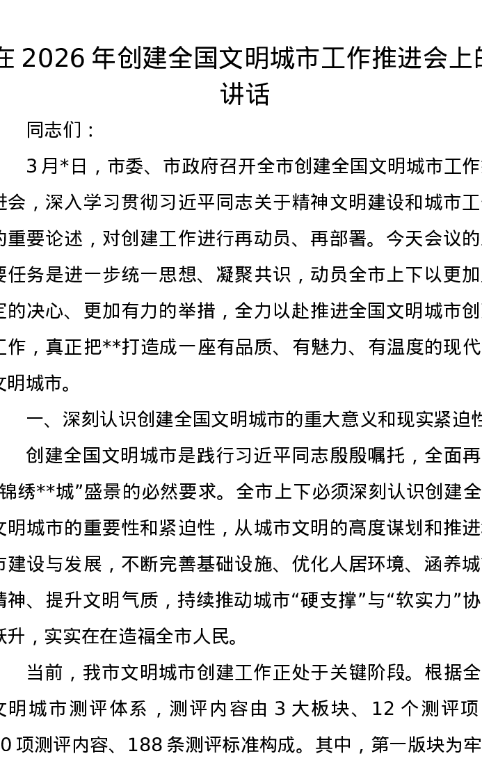在2026年创建全国文明城市工作推进会上的讲话
