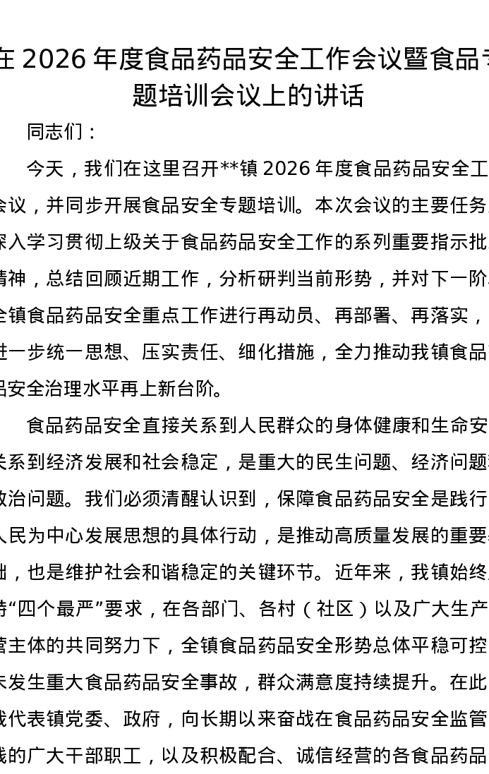 在2026年度食品药品安全工作会议暨食品专题培训会议上的讲话