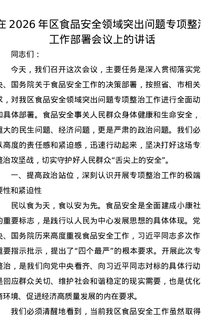 在2026年区食品安全领域突出问题专项整治工作部署会议上的讲话