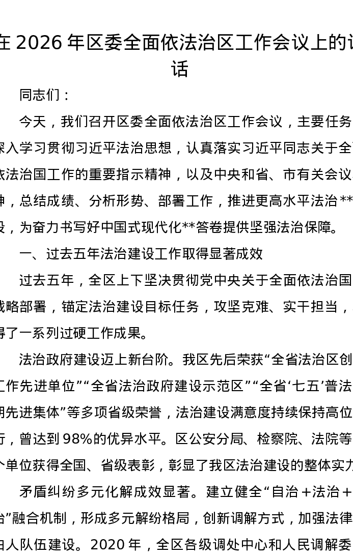 在2026年区委全面依法治区工作会议上的讲话