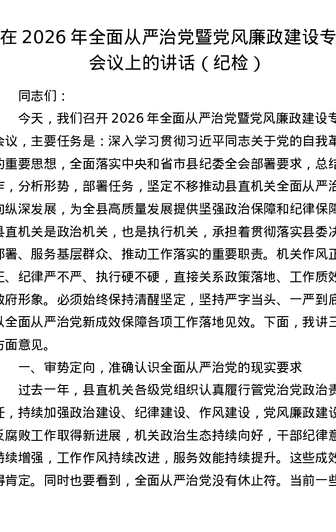 在2026年全面从严治党暨党风廉政建设专题会议上的讲话(纪检)