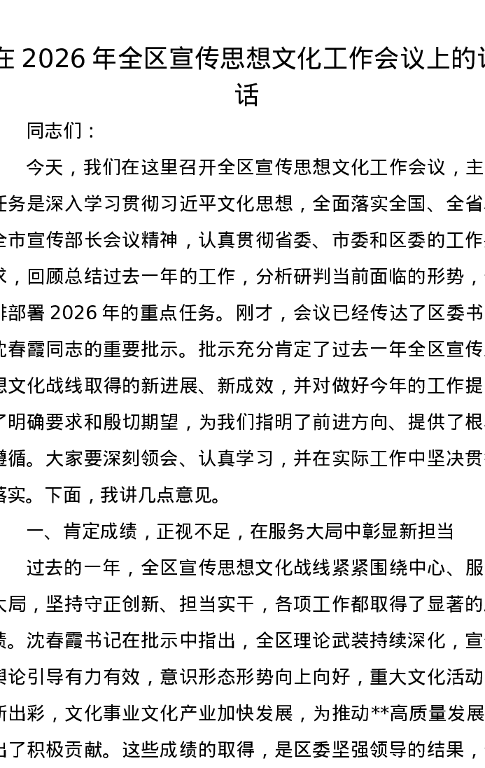 在2026年全区宣传思想文化工作会议上的讲话