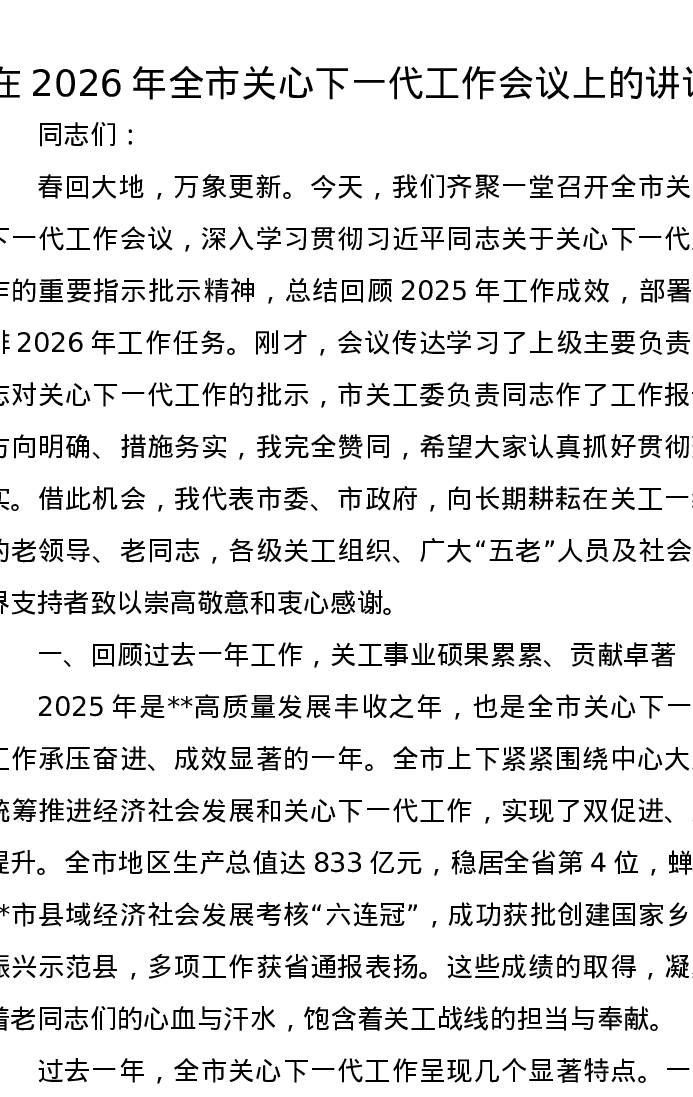在2026年全市关心下一代工作会议上的讲话