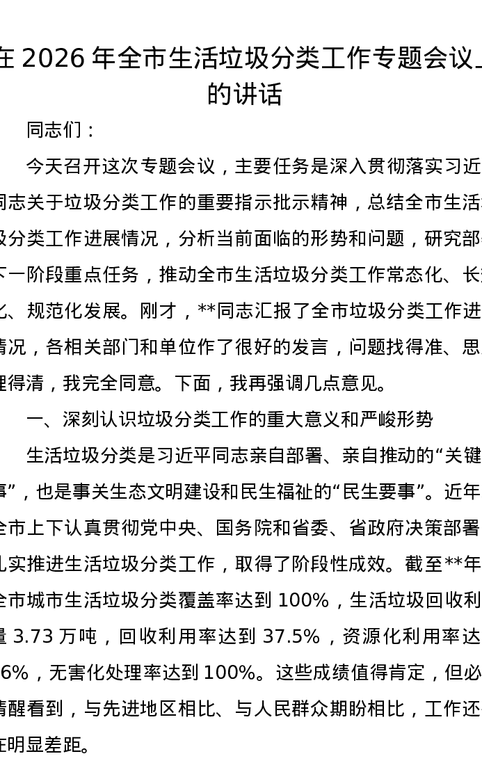 在2026年全市生活垃圾分类工作专题会议上的讲话