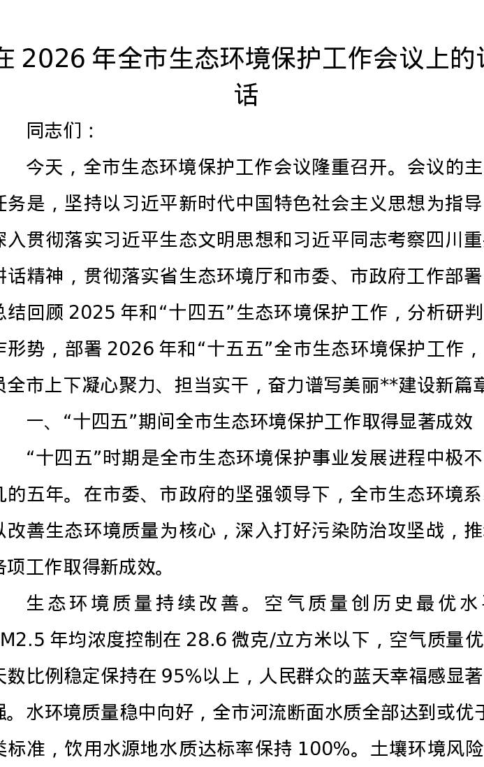 在2026年全市生态环境保护工作会议上的讲话