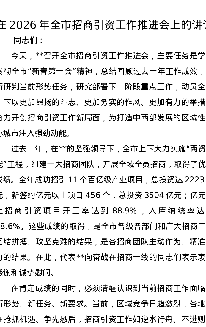 在2026年全市招商引资工作推进会上的讲话