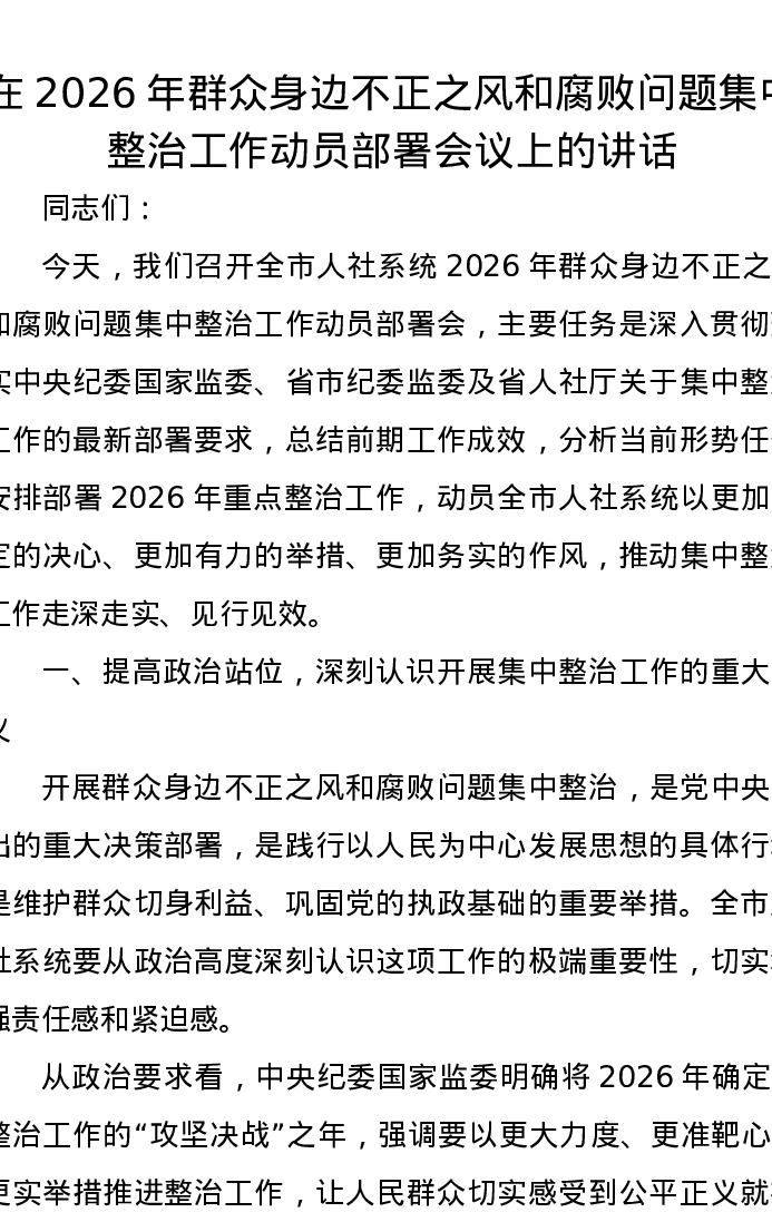 在2026年群众身边不正之风和腐败问题集中整治工作动员部署会议上的讲话