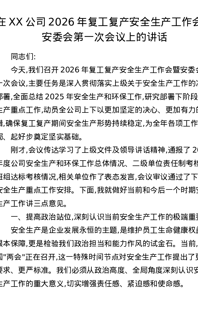 在XX公司2026年复工复产安全生产工作会暨安委会第一次会议上的讲话