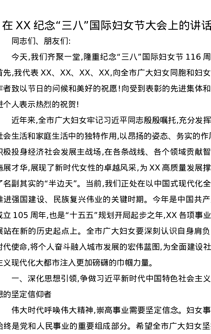 在XX纪念三八国际妇女节大会上的讲话