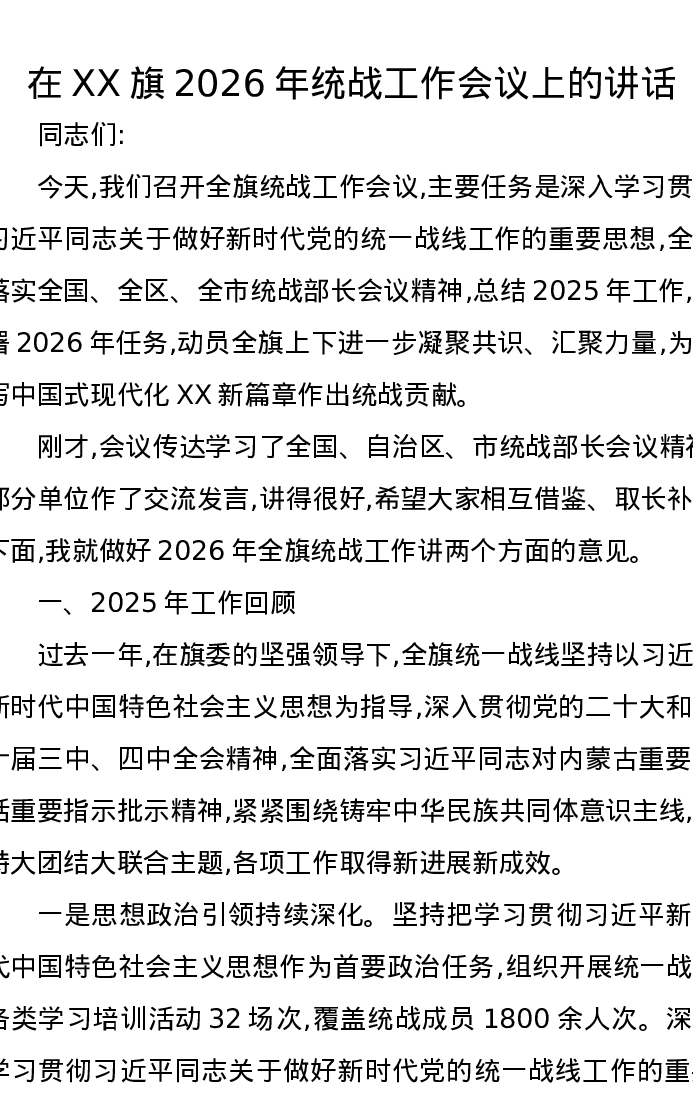 在XX旗2026年统战工作会议上的讲话