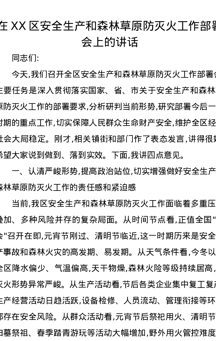 在XX区安全生产和森林草原防灭火工作部署会上的讲话