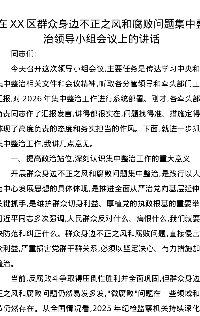 在XX区群众身边不正之风和腐败问题集中整治领导小组会议上的讲话