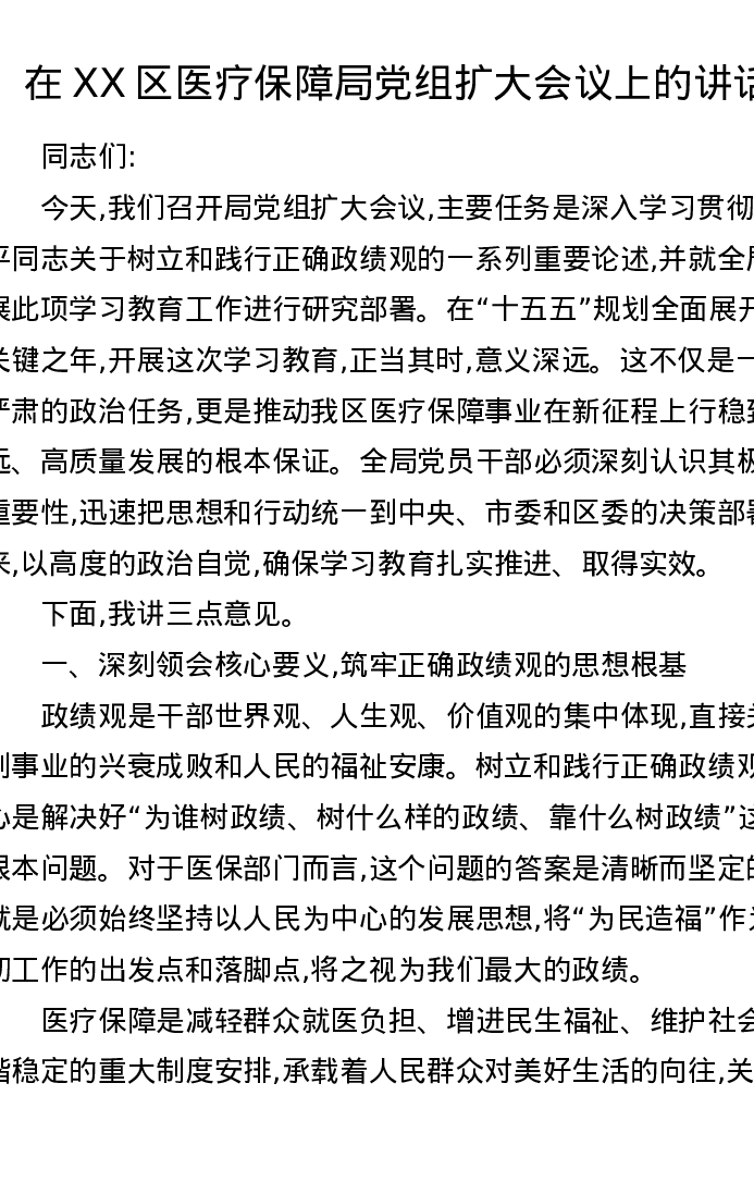在XX区医疗保障局党组扩大会议上的讲话
