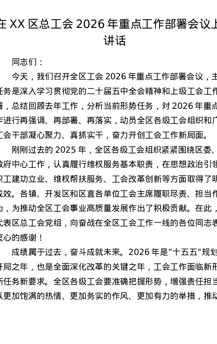 在XX区总工会2026年重点工作部署会议上的讲话