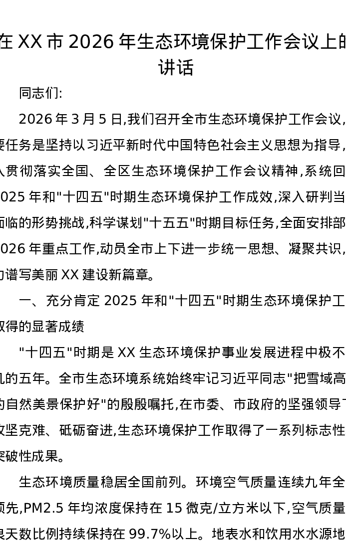 在XX市2026年生态环境保护工作会议上的讲话2