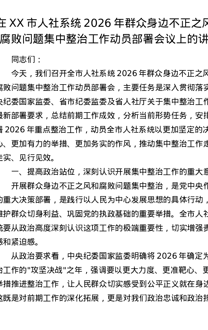 在XX市人社系统2026年群众身边不正之风和腐败问题集中整治工作动员部署会议上的讲话