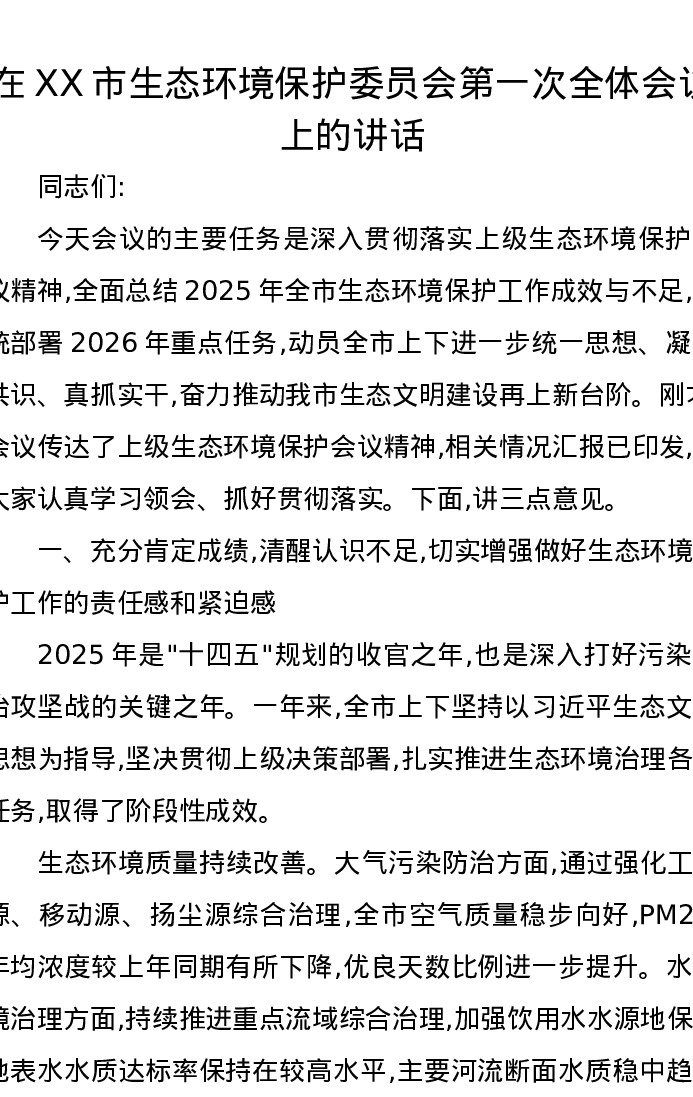 在XX市生态环境保护委员会第一次全体会议上的讲话